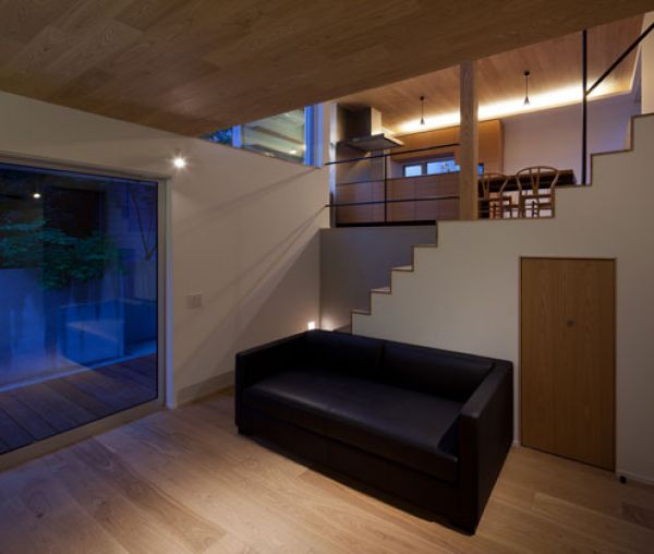スキップフロアを駆使した住宅である。 敷地は北面で接道し、3方が家屋に囲われているが、南東の方向にのみ開けている。その土地の特性を最大限活かすことが、この計画のテーマである。 そのテーマに対して、建物を2つのボリュームに分けて、それらをずらすことによって解決を試みた。 2つのボリュームは、南東からの光を室内になるべく多く導入するために、南北にずらして配置され、また、それら2つのうち、西側のボリュームについては、床を持ち上げることによって、南東からの光をさらに多く室内に取り入れられるよう、配慮している。 2つのボリュームの間に生じた、この3次元的な「ズレ」は、すまいの中に縦方向の空間のつながりを形成し、すまい全体の一体感をもたらしている。 室内の床や天井には、タモの無垢材を多用し、空間の一体感を演出するとともに、経年変化を楽しんでいただけるよう心掛けた。 室内の壁に関しては、手仕事によるモノづくりの美しさを追求するために、ビニルクロスではなく、塗装仕上げとした。 キッチンは、ステンレス天板とタモの組み合わせによる、オーダーキッチンとした。 ダイニングテーブルも、タモのハギ合わせ材を天板に使用した特注品とし、ホンモノの材料が持つ独特の存在感が空間に彩を添えている。 外壁は、ここでも手仕事の美しさを追求するために、ガルバリウムの板金材を採用している。建具には、ステンレス材を使用し、意匠性とともに、メンテナンスの軽減を図っている。