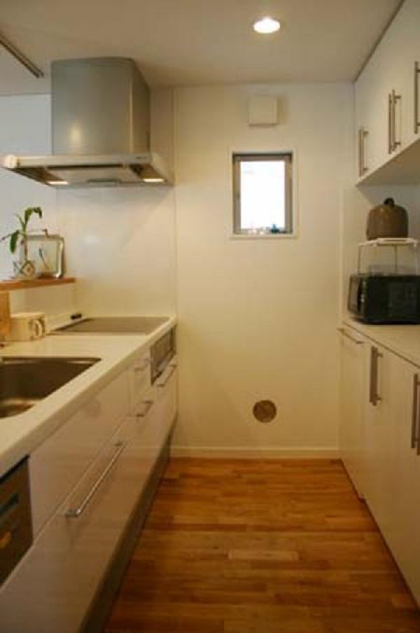 夫婦と子供1人の3人家族のための住宅です。 周りには驚くほど緑が豊かに残っており、傾斜によって敷地から東側の公園に向かって低くなっているため2階北側のテラスからは隣家や公園の樹木が借景として眺めることができ、あたかも公園が自分達の庭であるような気分にさせてくれます。 また、2階北側テラスの道路側に面する部分をアルミアングル材によるルーバーで覆うことで内外に対して圧迫感を与えずに風を通しつつプライバシーも確保しています。 見晴らしの良い2階にリビング・ダイニング、1階に書斎とプライベートスペースを真ん中に配した廊下と階段でつなぐプランになっています。内玄関から1階室内すべての段差を無くしているため、玄関扉を開けて入ると上がり框の無い白いタイル貼りの玄関廊下がまっすぐに伸び南側の庭へと続いています。 2階リビング南のハイサイドライトと階段上部のスリット窓からの光が1階の玄関・廊下へと差込み、とかく暗くなりがちな中廊下式プランの欠点を解消しています。 2階リビングは天井高さが3.65mある開放的な空間で、夏は南から入る風が北側上部のガラスルーバー窓から通り抜けます。一方冬は暖かい日差しがリビング全体に当たるので晴れた日の日中はエアコンや床暖房に頼ることなく理想的な環境の中で生活することができます。